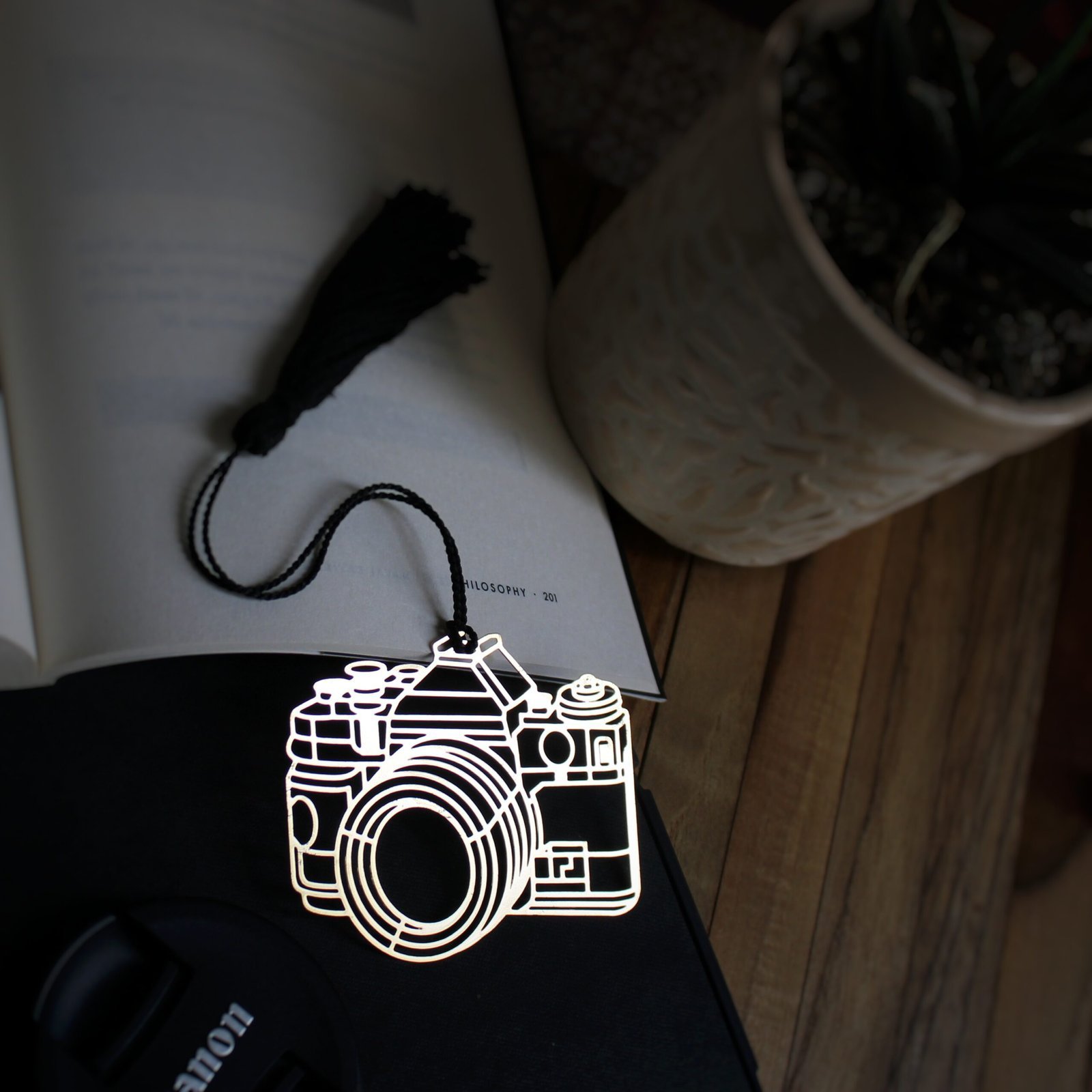 Design Features: This eco-friendly brass bookmark features a finely detailed DSLR camera, symbolizing creativity and passion. The brass finish adds a stylish touch, perfect for photography enthusiasts.