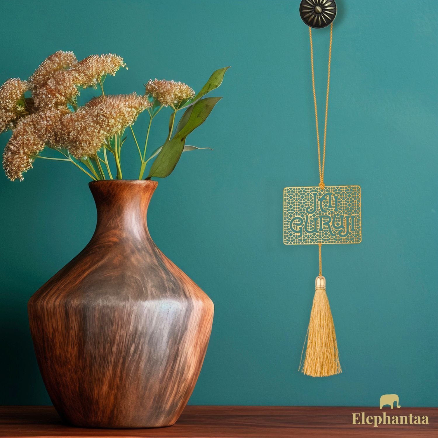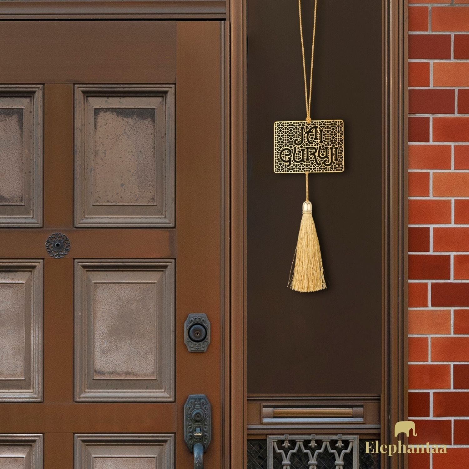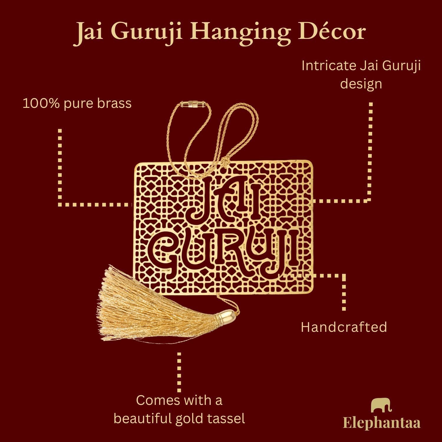 This elegant hanging accessory is crafted from high-quality brass, featuring the sacred words “Jai Guruji” with intricate detailing. Its minimalist design and polished finish make it a subtle yet powerful spiritual symbol.