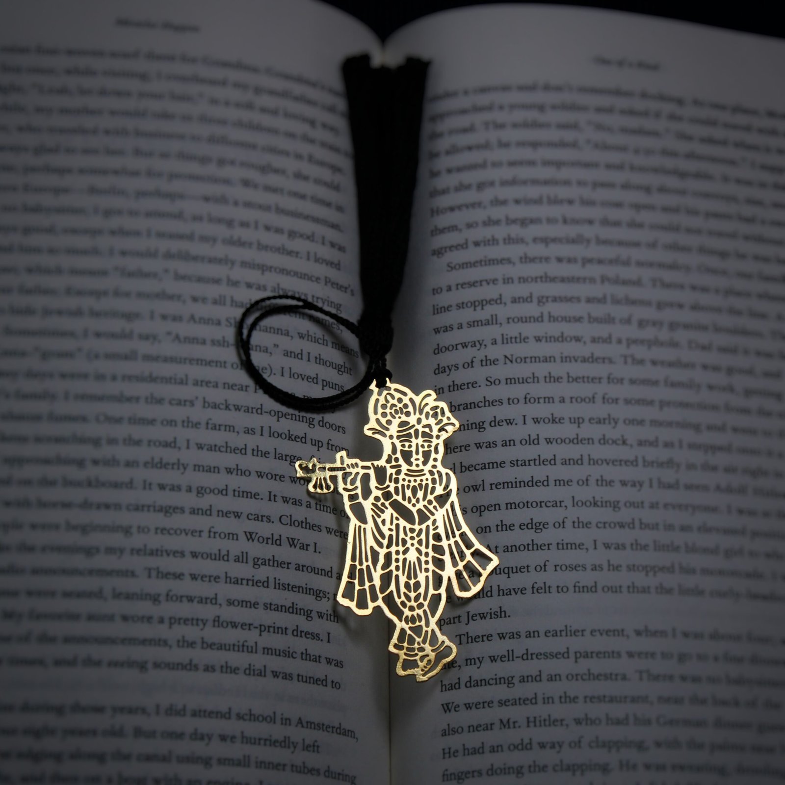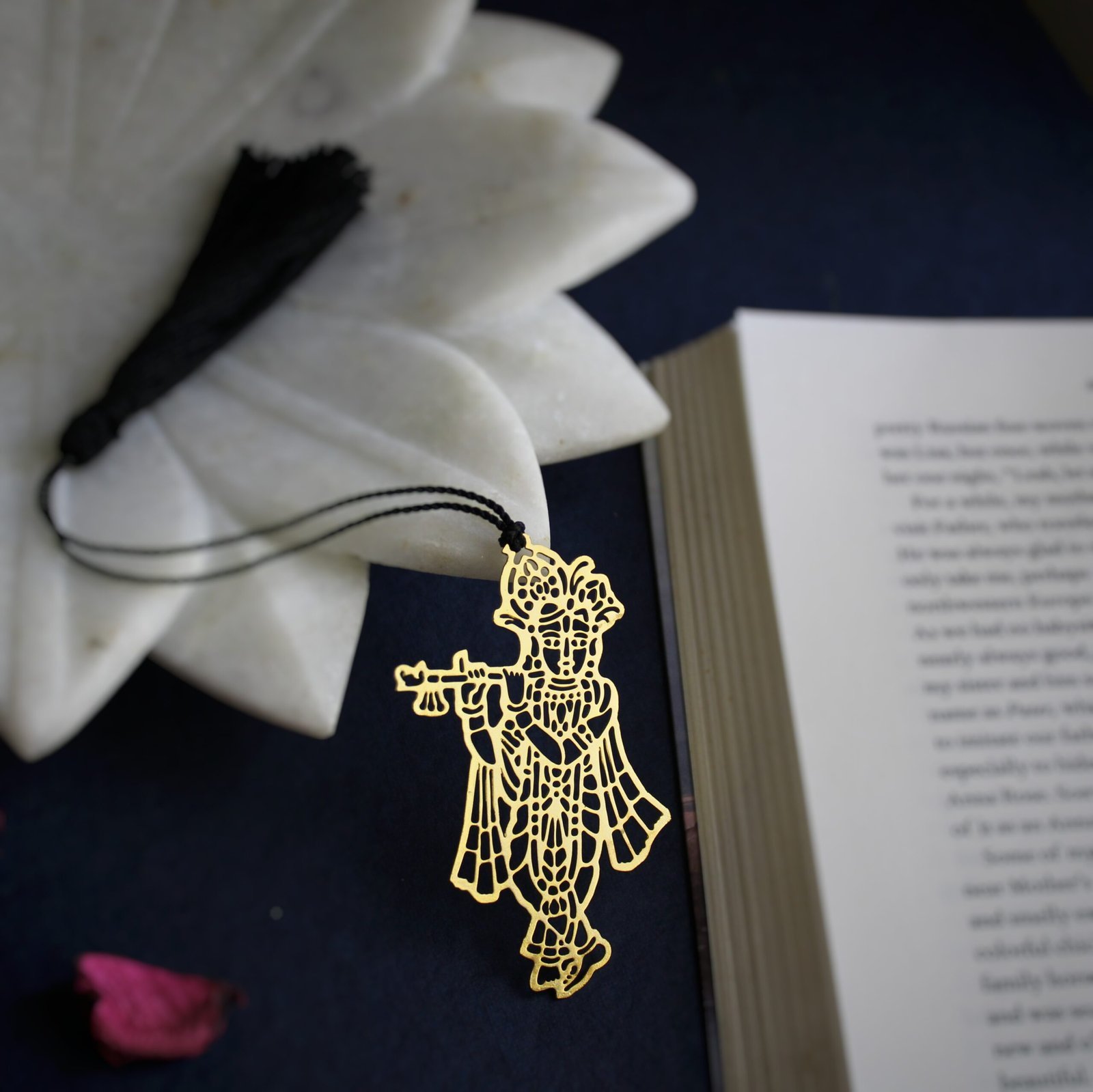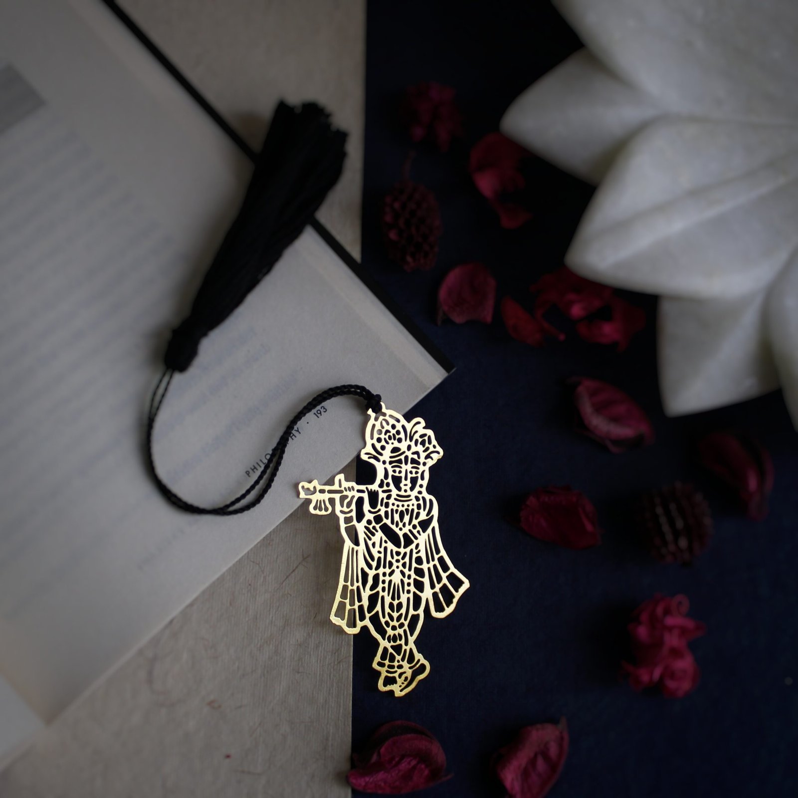Design Features: This eco-friendly brass bookmark features a detailed image of Lord Krishna playing the flute, symbolizing divine love and joy. The brass finish adds a sacred touch, making it both beautiful and spiritual.